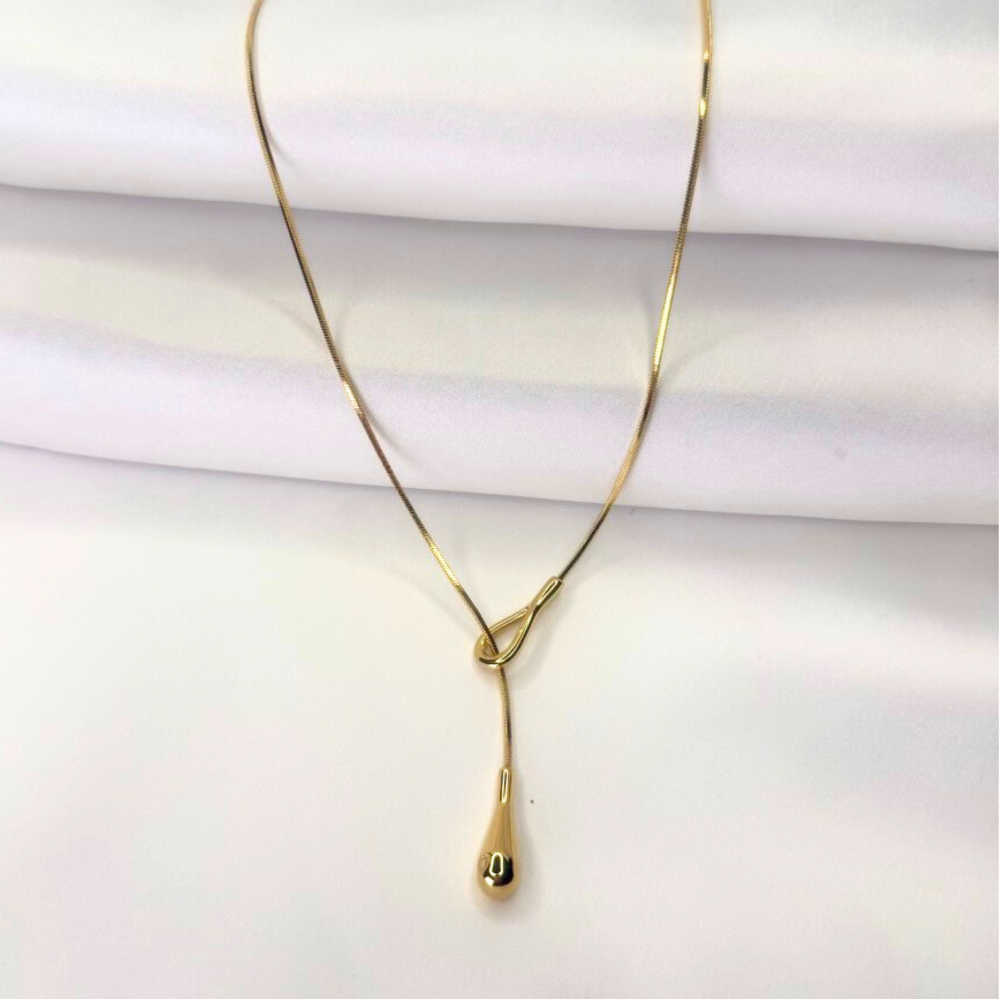 Effortless elegance, elongated. This unique Stainless Steel necklace features a smooth snake chain that forms a subtle knot, culminating in a polished gold teardrop pendant. Perfect for adjustable, deep V-neck styling.