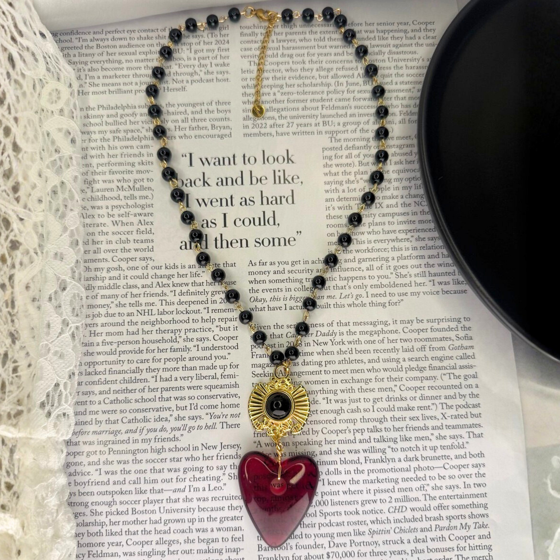 Bold romance, gothic glam. This striking gold-toned Stainless Steel necklace features a chain of black beads leading to a dramatic, deep red enamel heart pendant. The heart is topped with a detailed, sun-burst CZ accent for maximum impact.