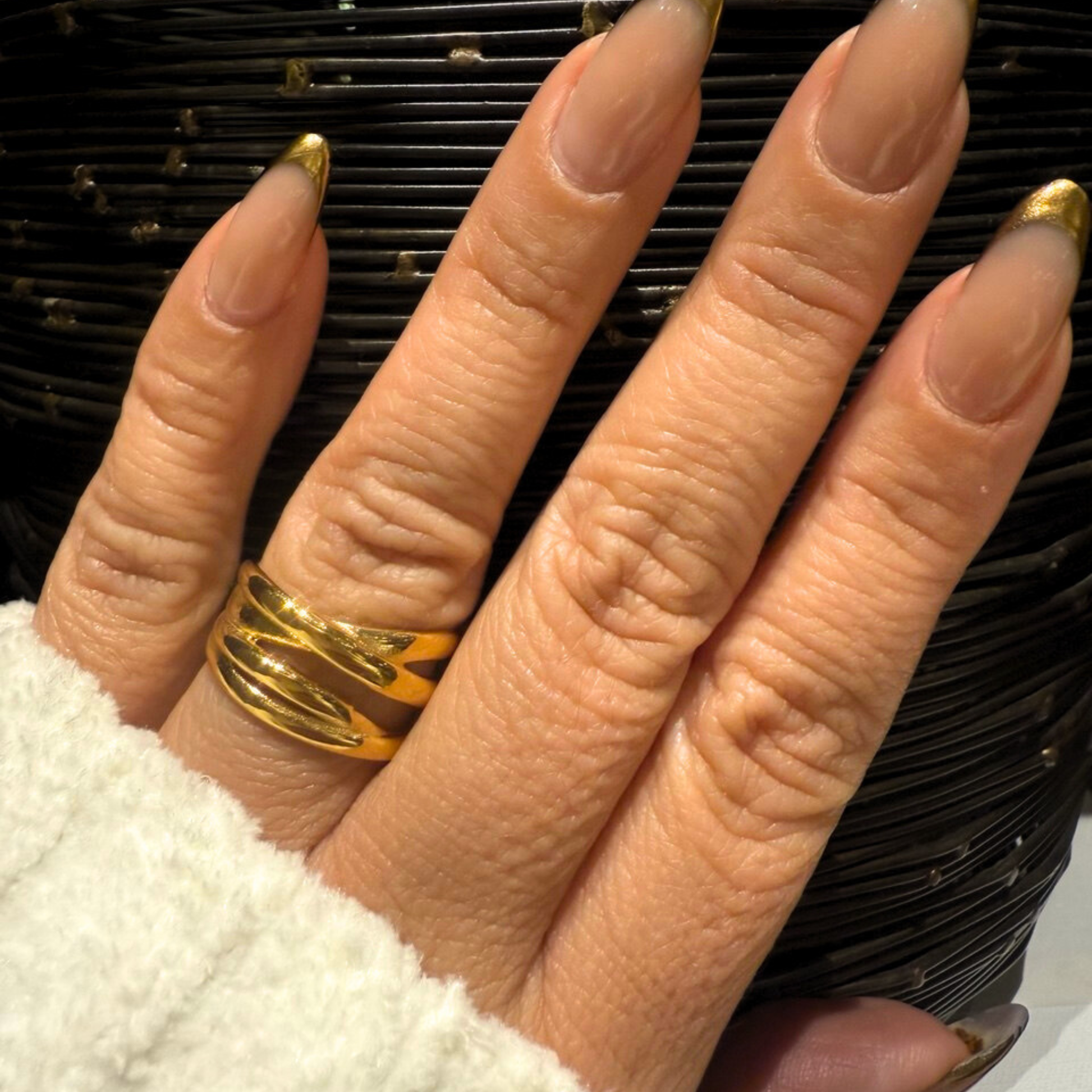 A sleek and modern wide band ring featuring highly polished gold-tone metal sculpted into a striking, continuous crossover design. Offers an effortlessly bold, minimalist look.