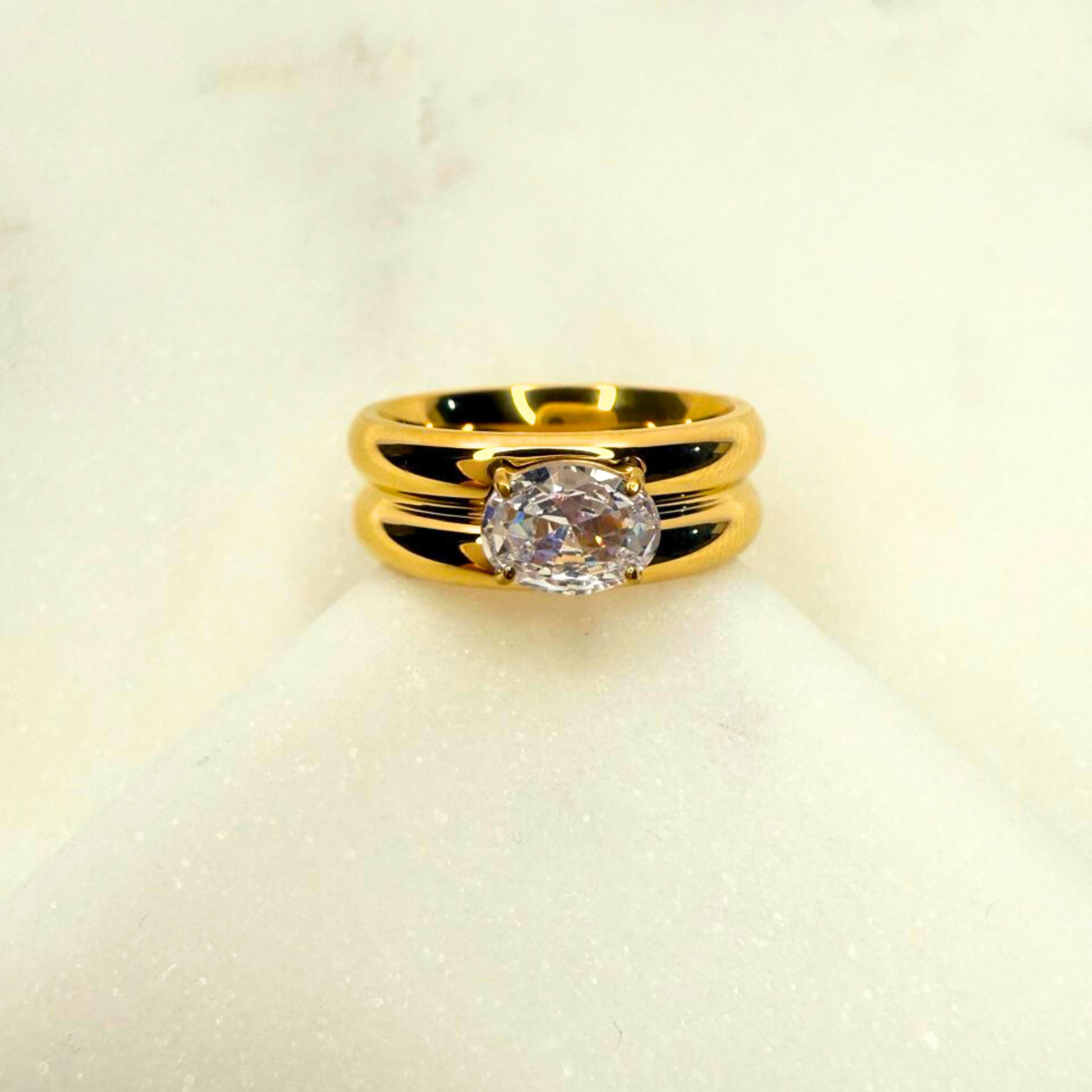 A classic yet modern ring featuring a brilliant oval-cut crystal set atop a polished, double-band design. This piece delivers timeless elegance with a contemporary foundation.