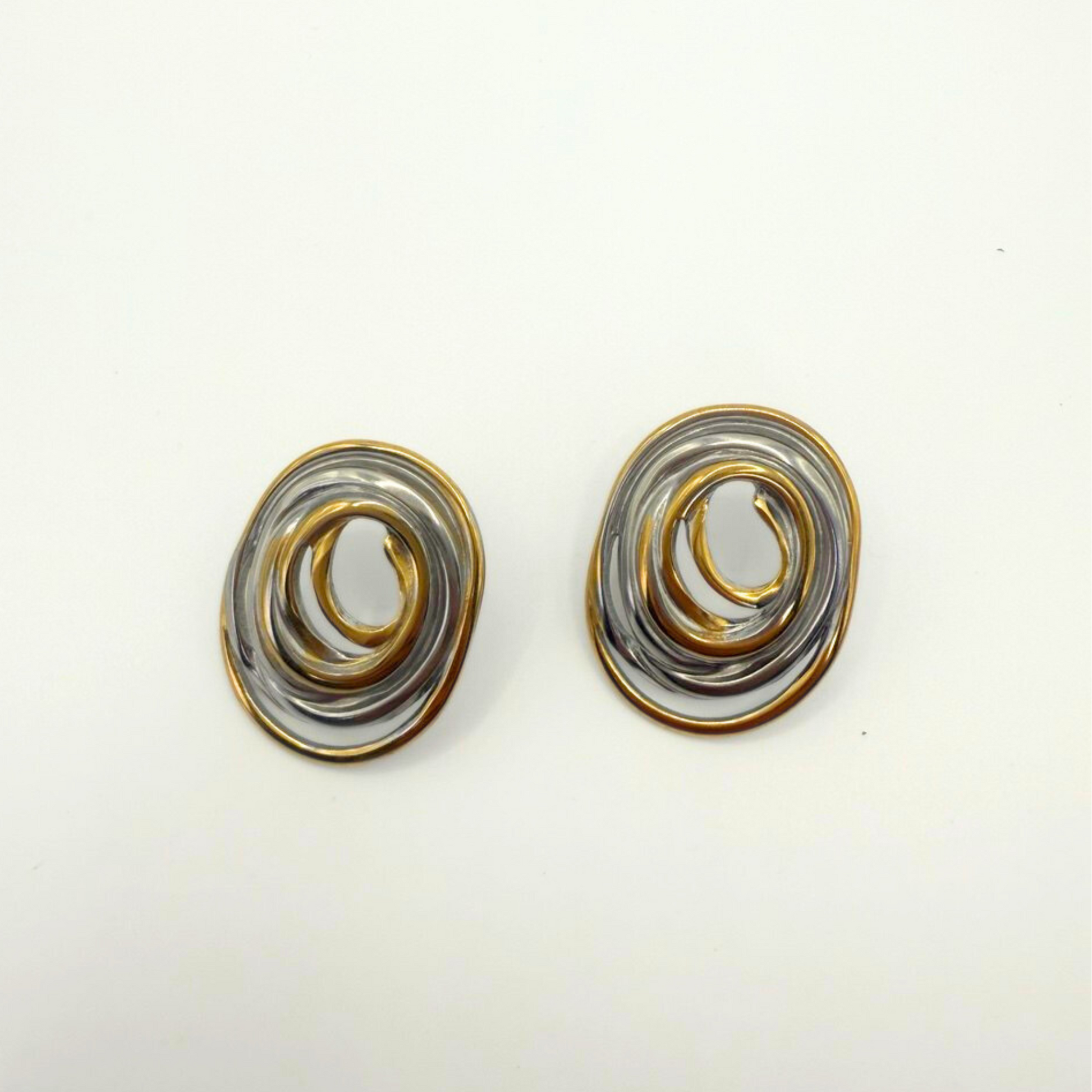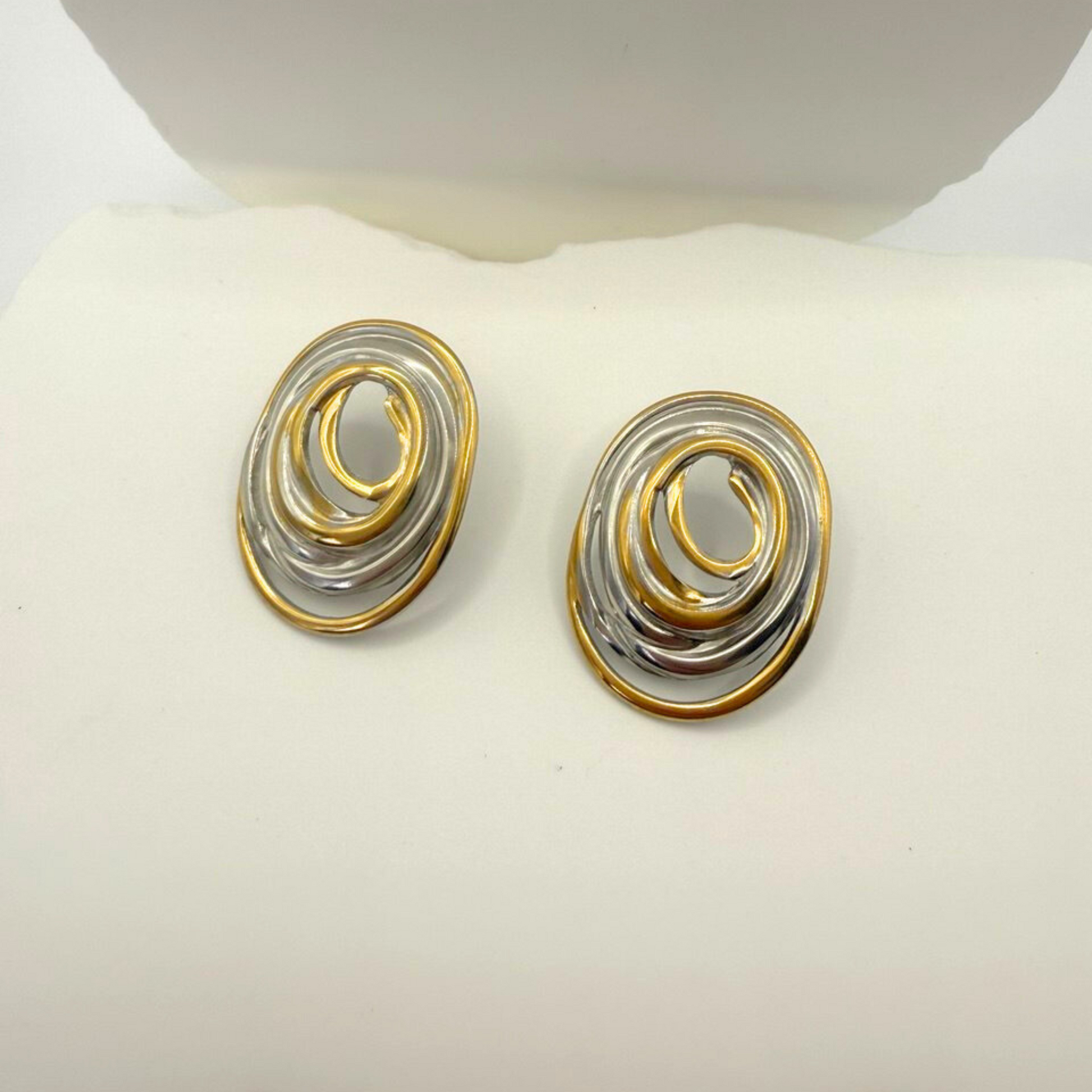 Make an artistic statement with our Orbit Hoops. These unique studs feature a captivating design of intertwined gold and silver-toned spirals, creating a modern and elegant look that's perfect for both day and night.