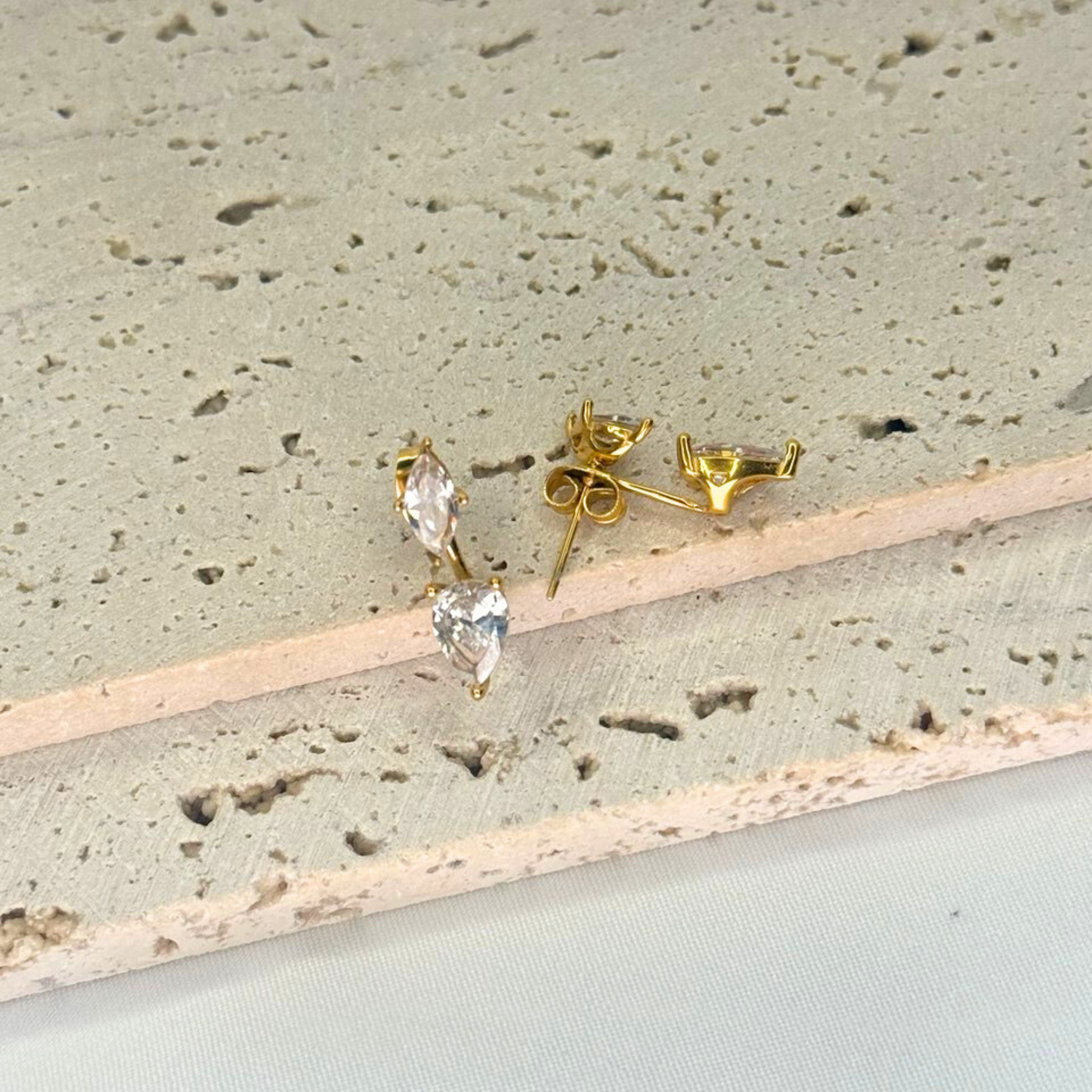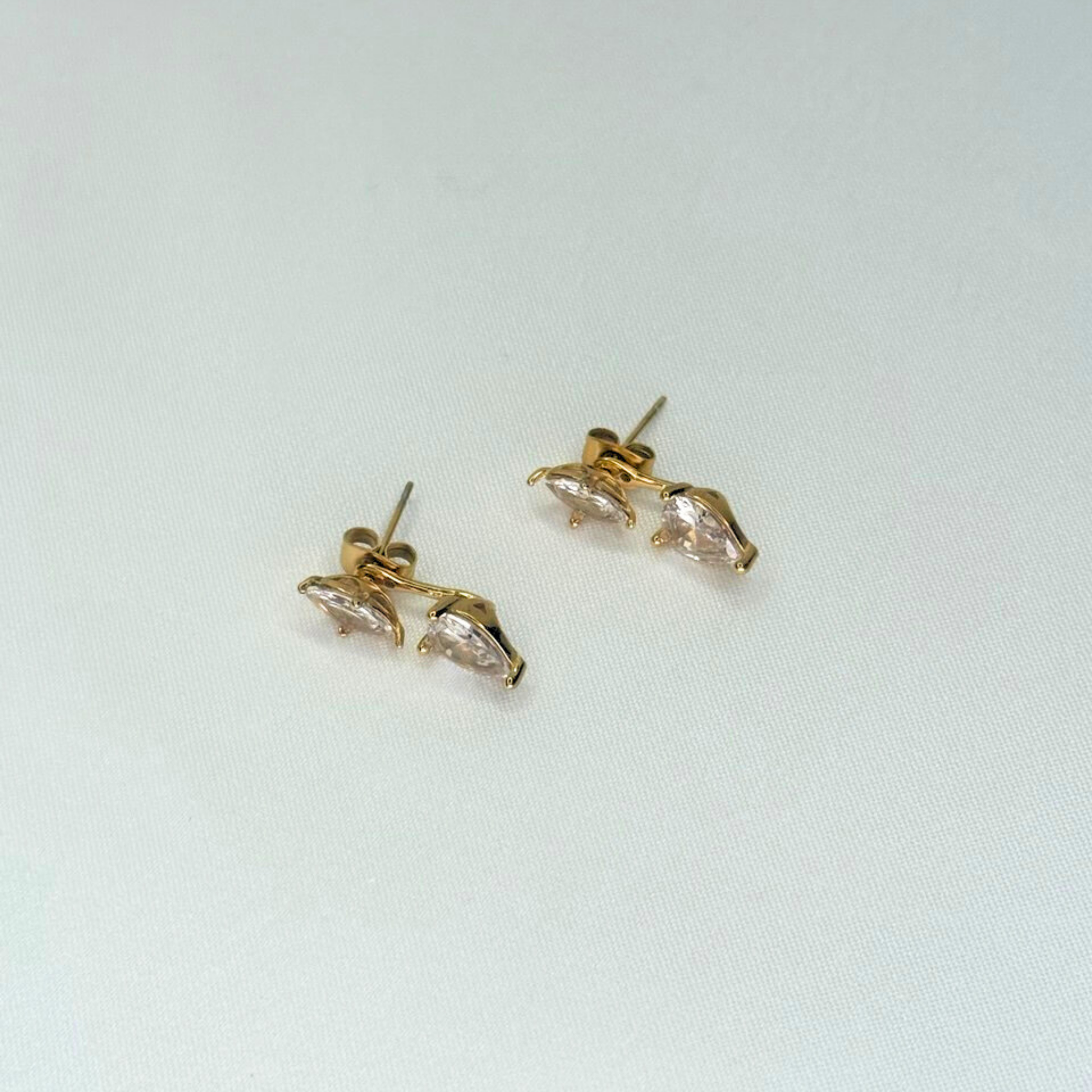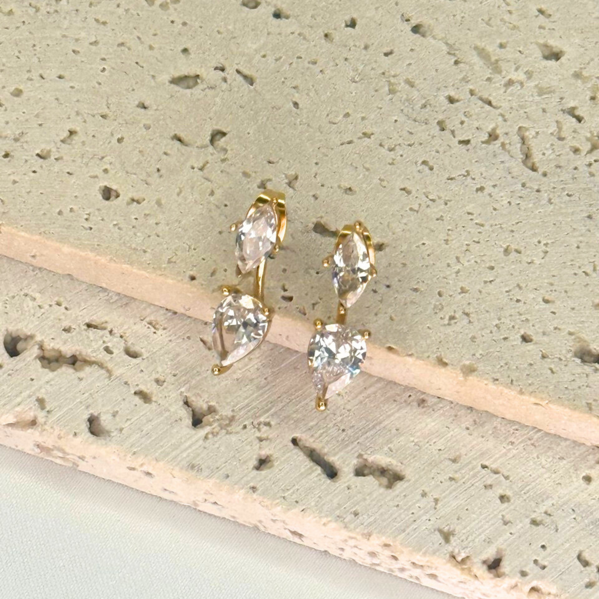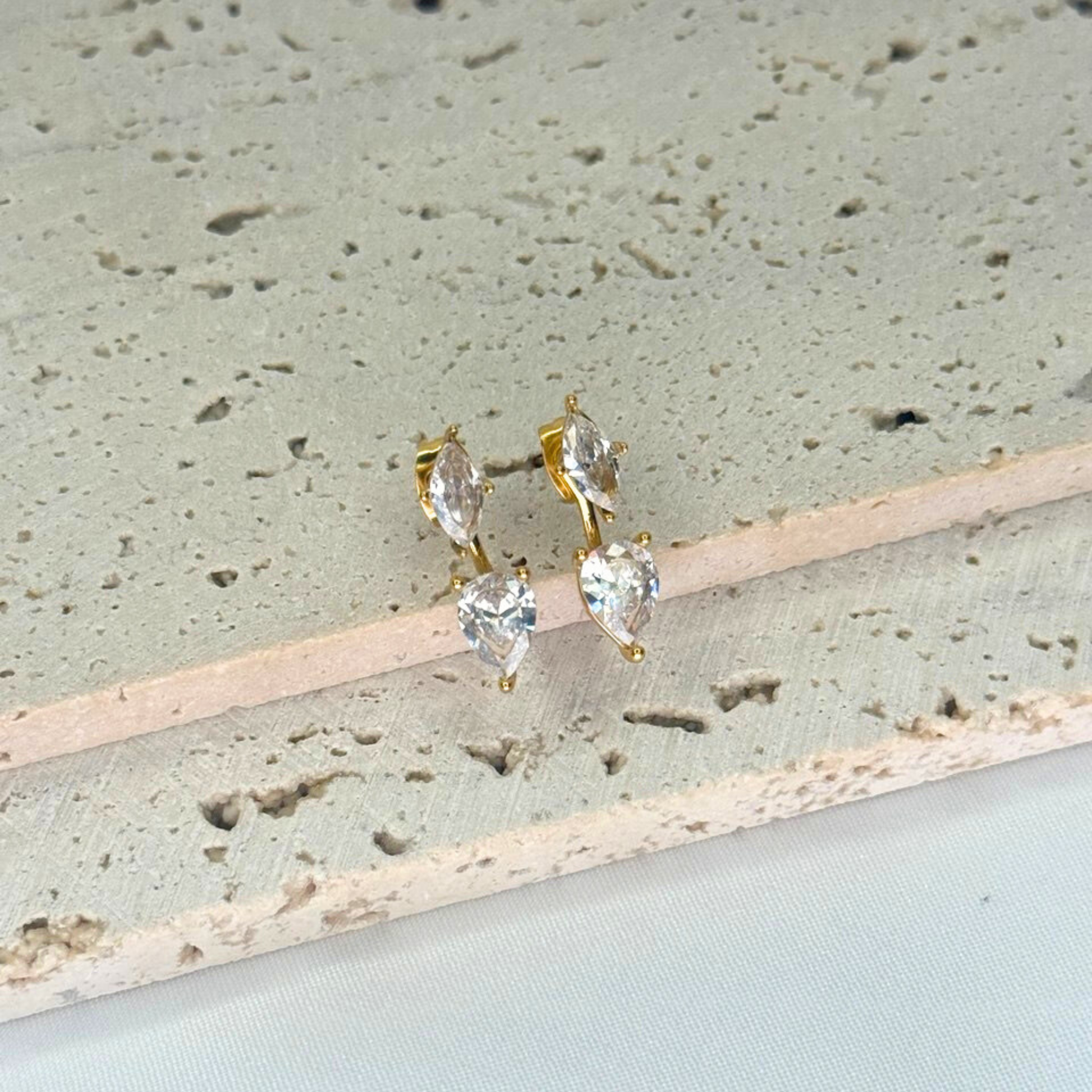 Modern drama, dual brilliance. These unique gold-toned Stainless Steel earrings feature two dazzling CZ stones—a marquise cut on top and a pear cut on the bottom—creating an elegant, upward sweep effect. Perfect for non-traditional sparkle.