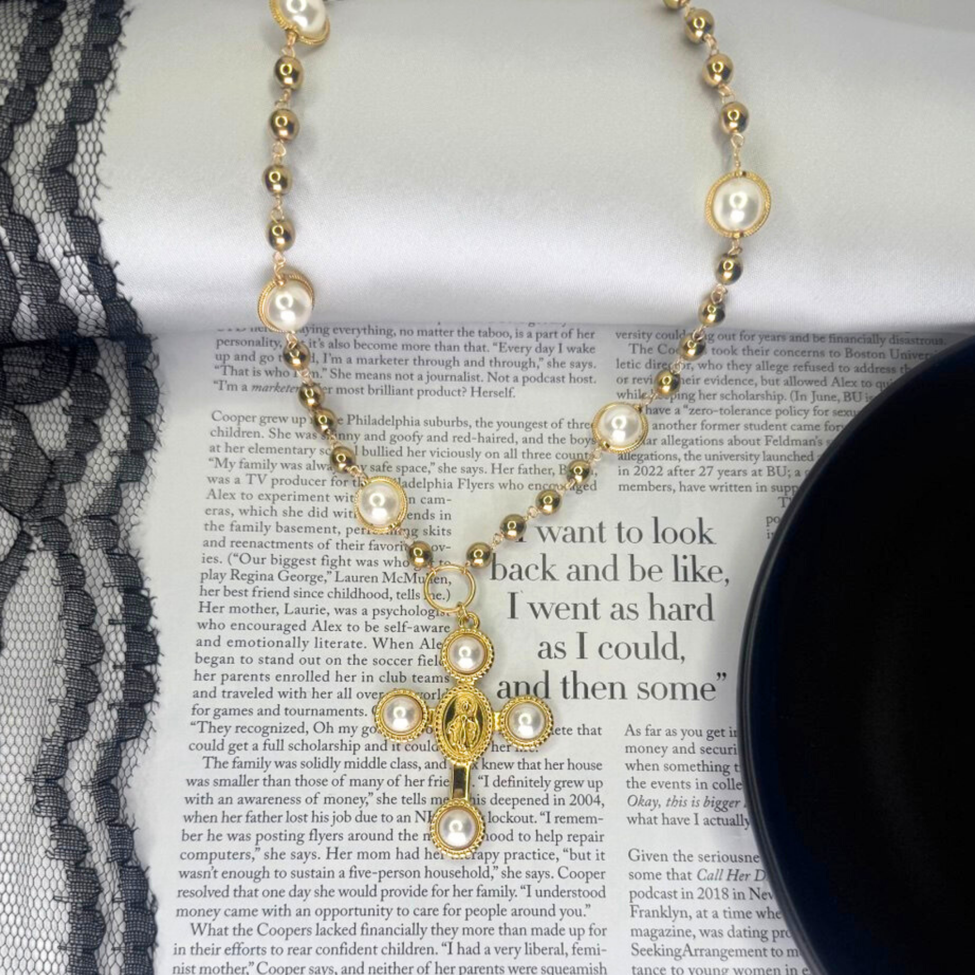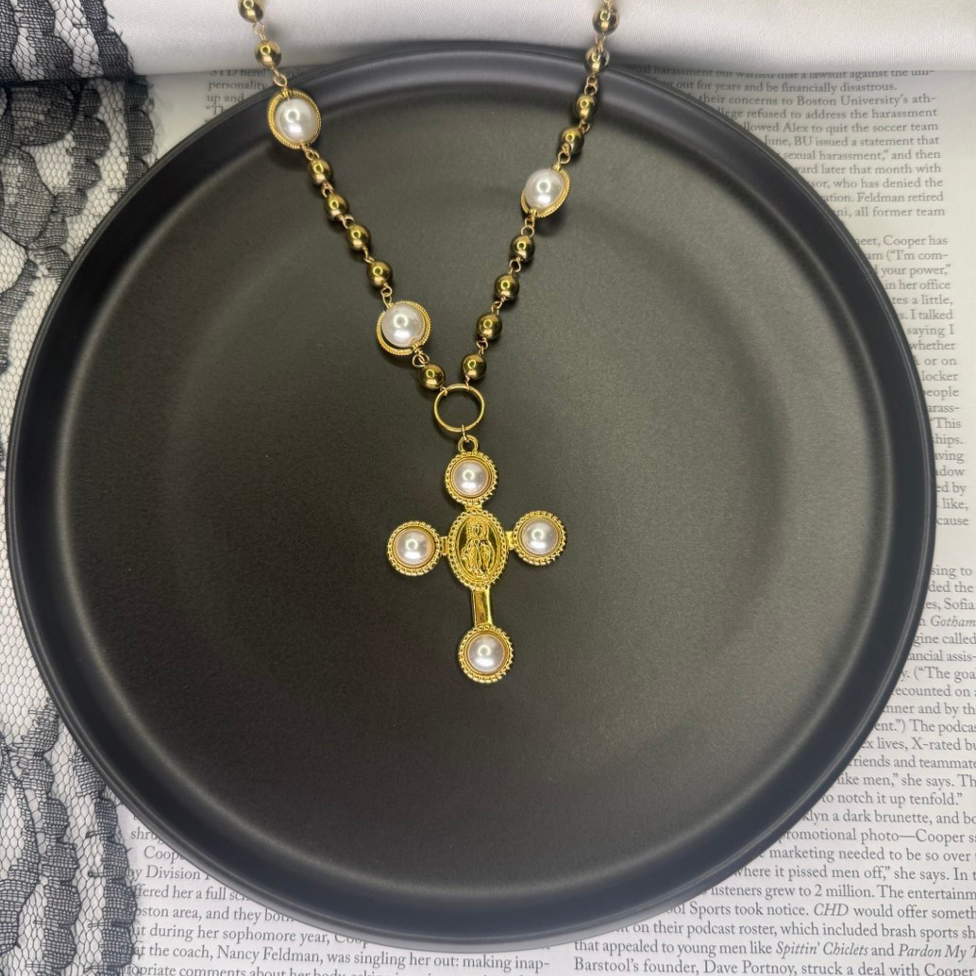 A piece of faith and elegance. This traditional gold-toned Stainless Steel necklace features a beautiful chain of polished golden beads alternating with luminous ivory-toned pearls. It culminates in an ornate cross pendant centered with an image of the Virgin Mary.