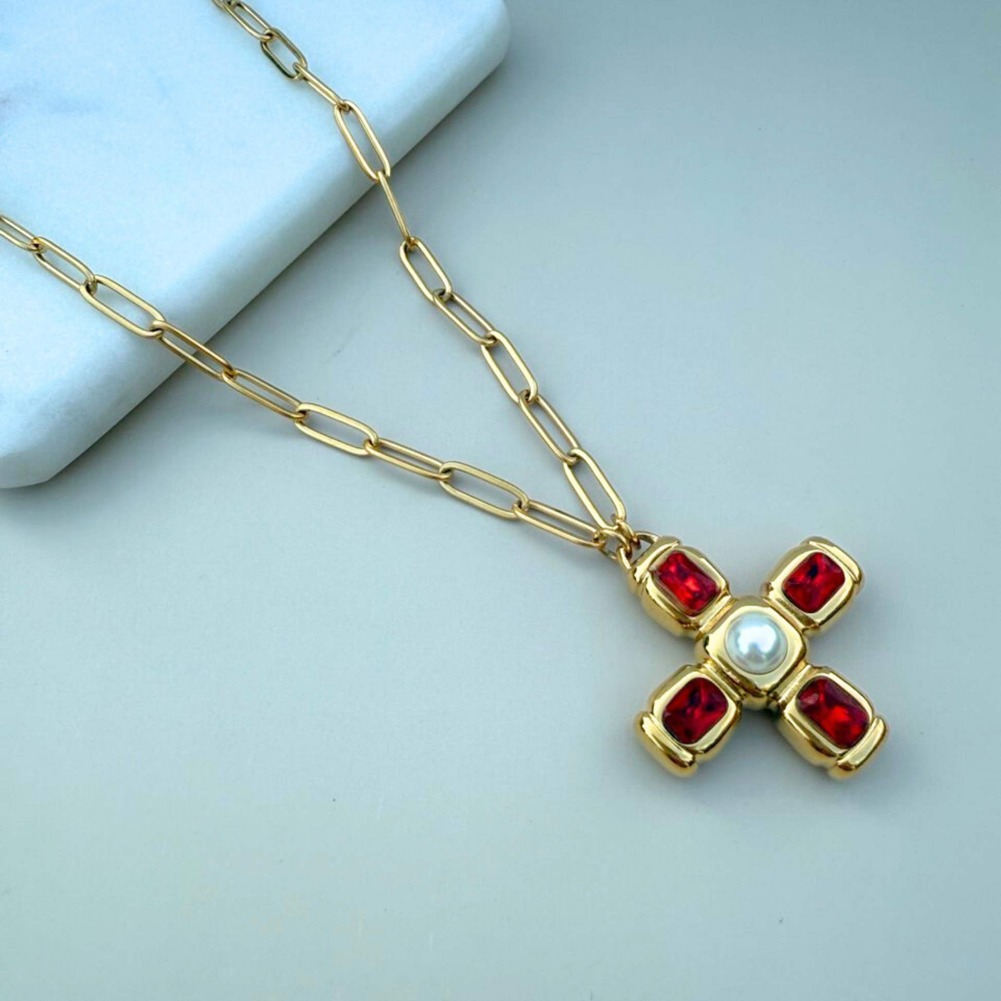 Make a powerful statement with this stunning cross pendant necklace. The bold, gold-toned cross is set with striking crimson-red stones on each arm and features a luminous pearl at its center. Suspended from a modern paperclip chain, this piece beautifully blends timeless elegance with contemporary style, making it a captivating accessory for any occasion.