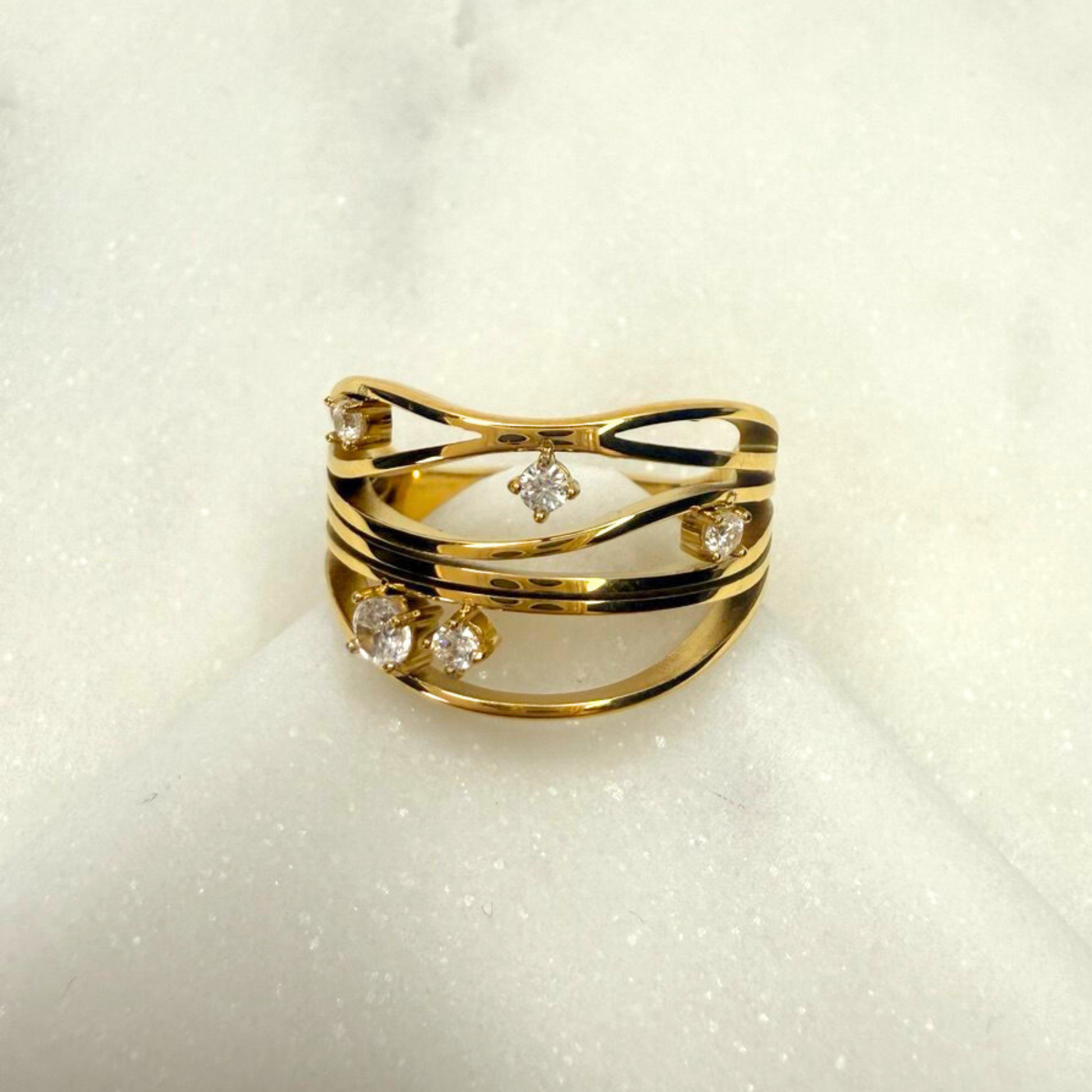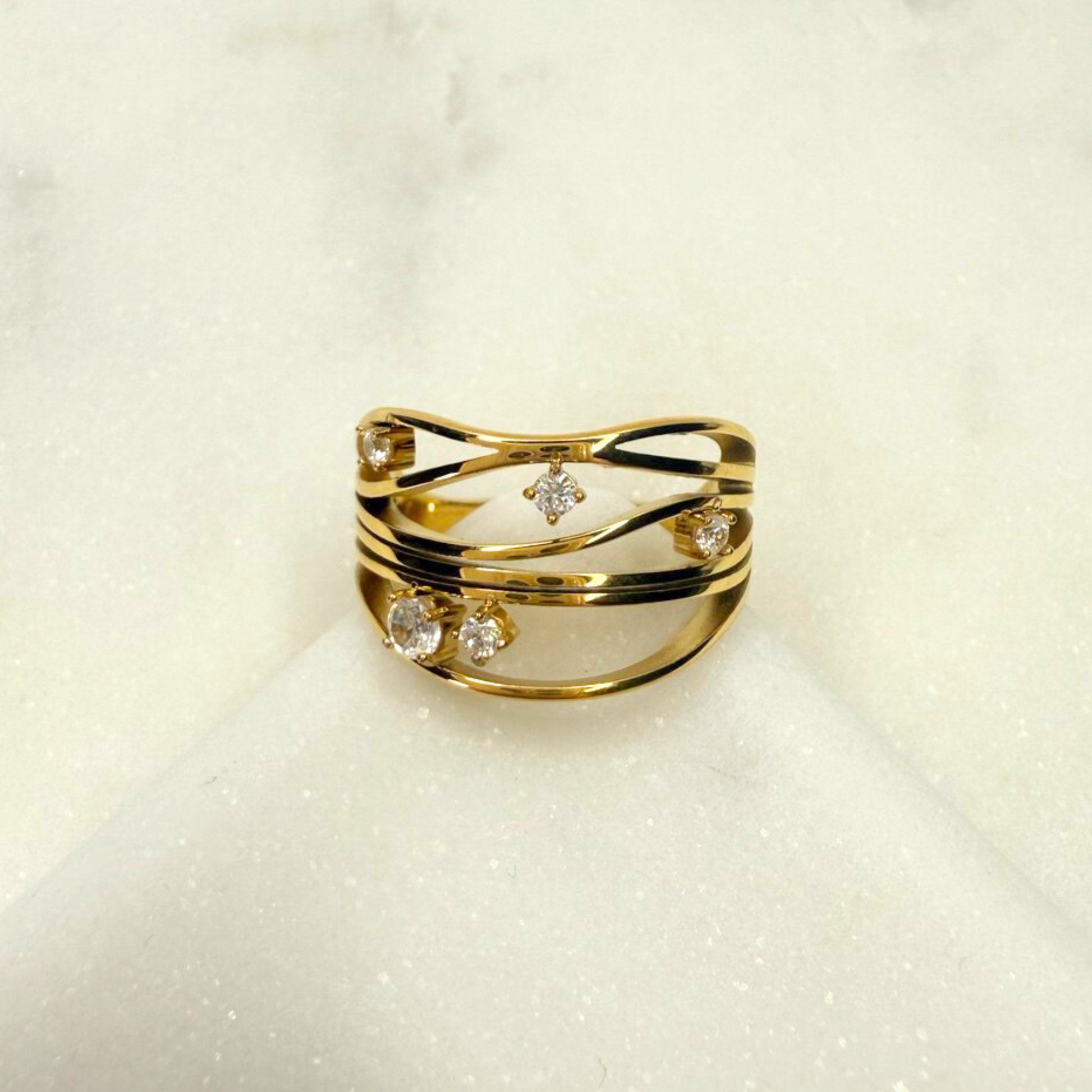 A contemporary wide band ring featuring layered, flowing gold-tone strands accented by scattered, bezel-set crystals. The open, airy design creates a look of effortless, celestial style.