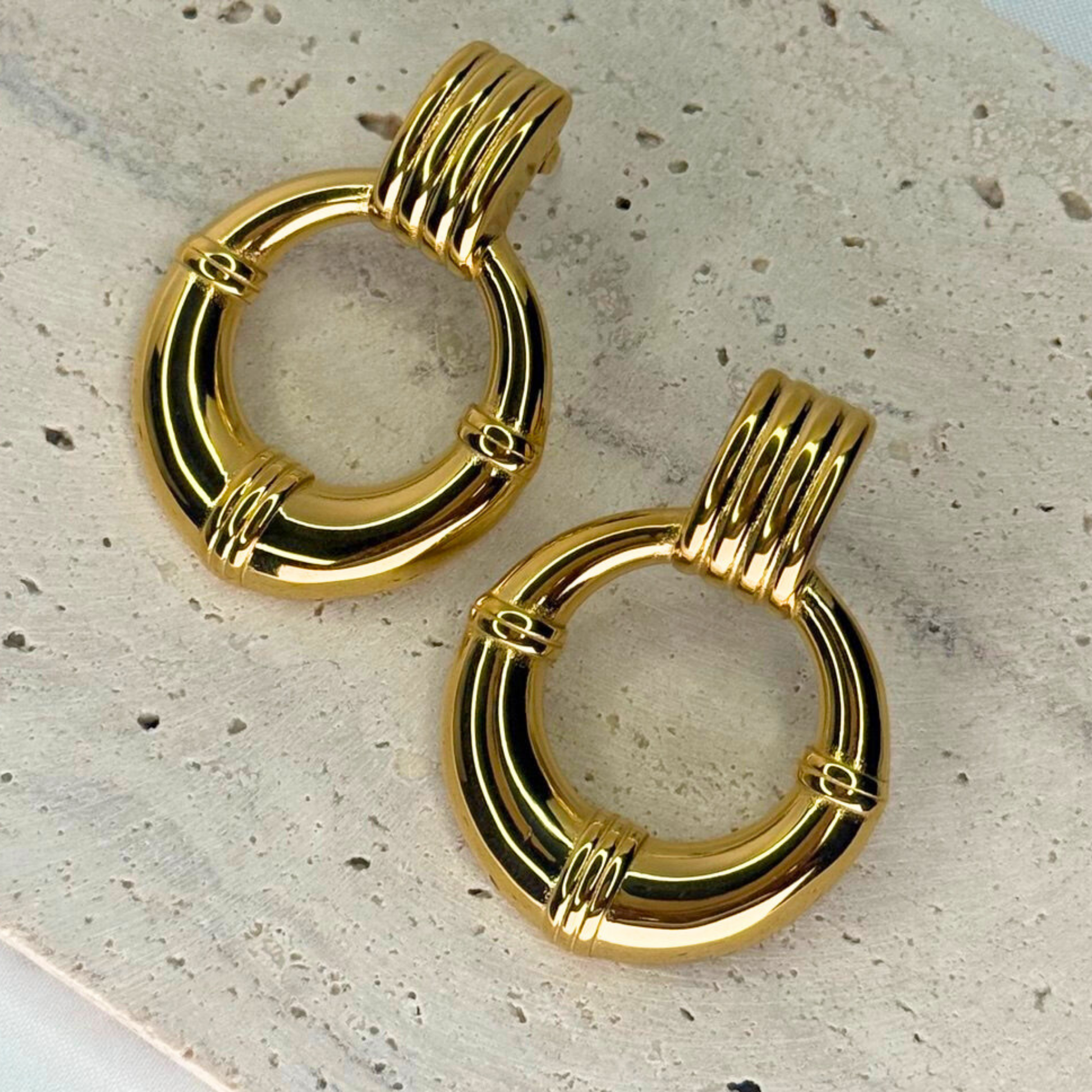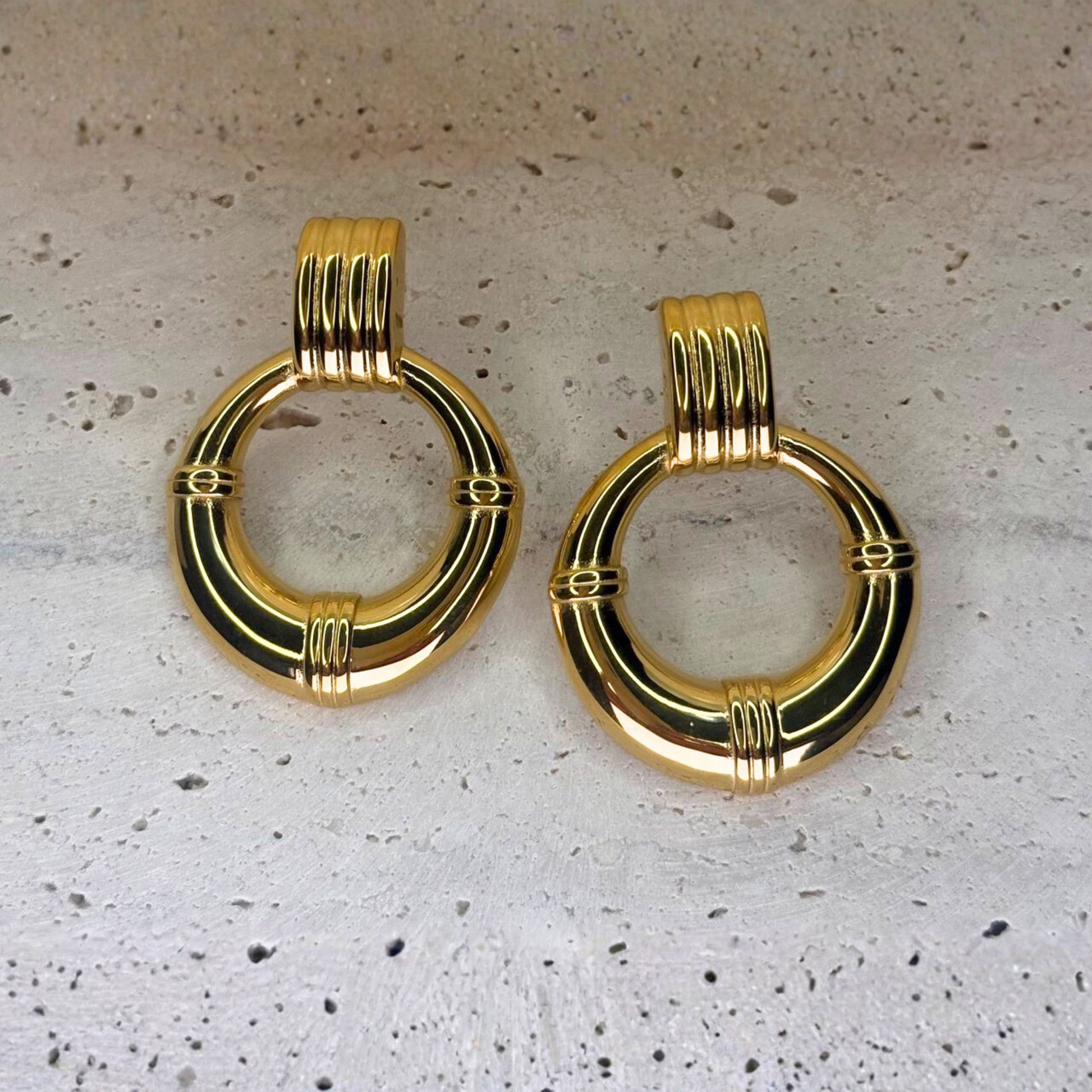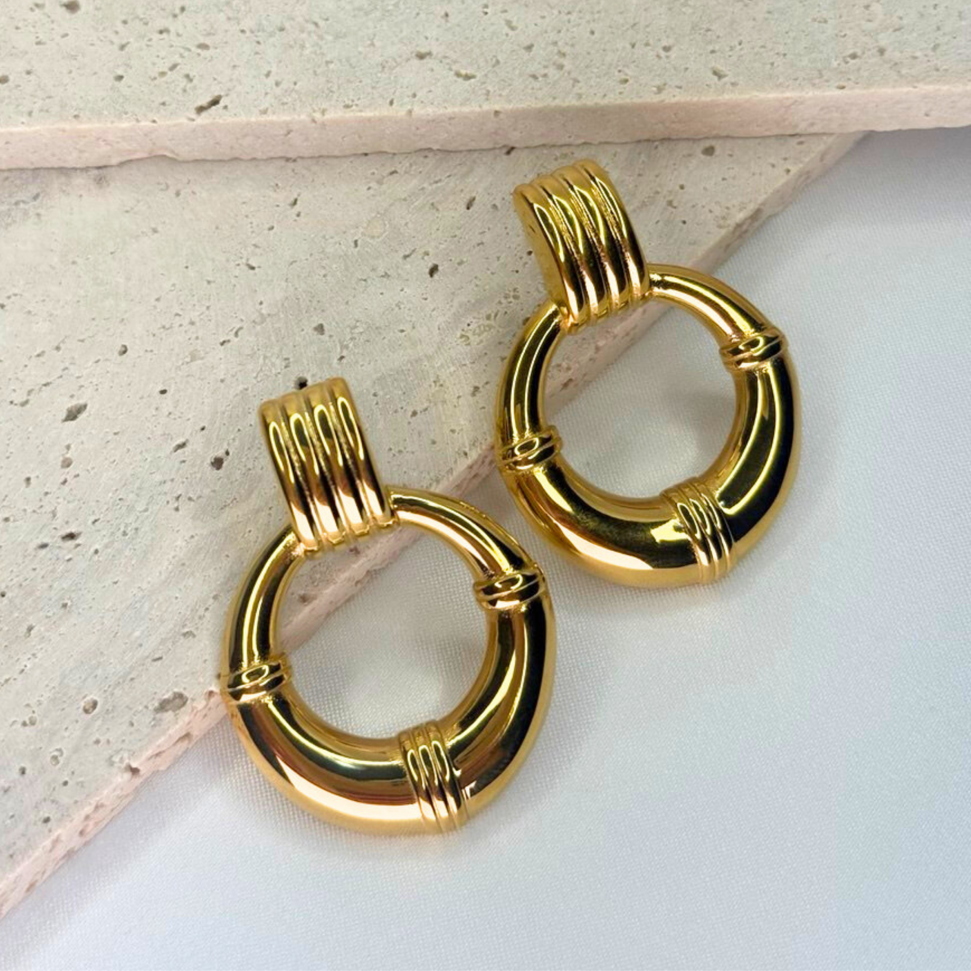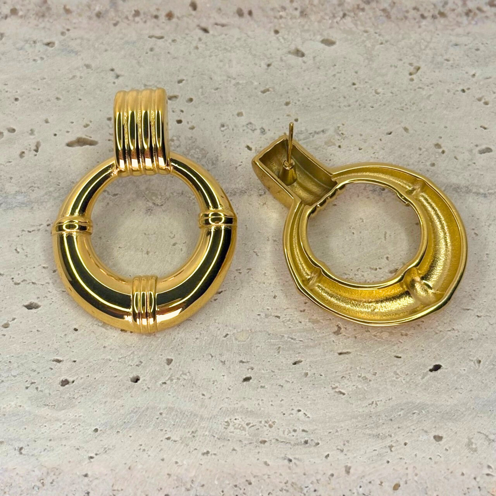 Modern drama, dual brilliance. These unique gold-toned Stainless Steel earrings feature two dazzling CZ stones—a marquise cut on top and a pear cut on the bottom—creating an elegant, upward sweep effect. Perfect for non-traditional sparkle.