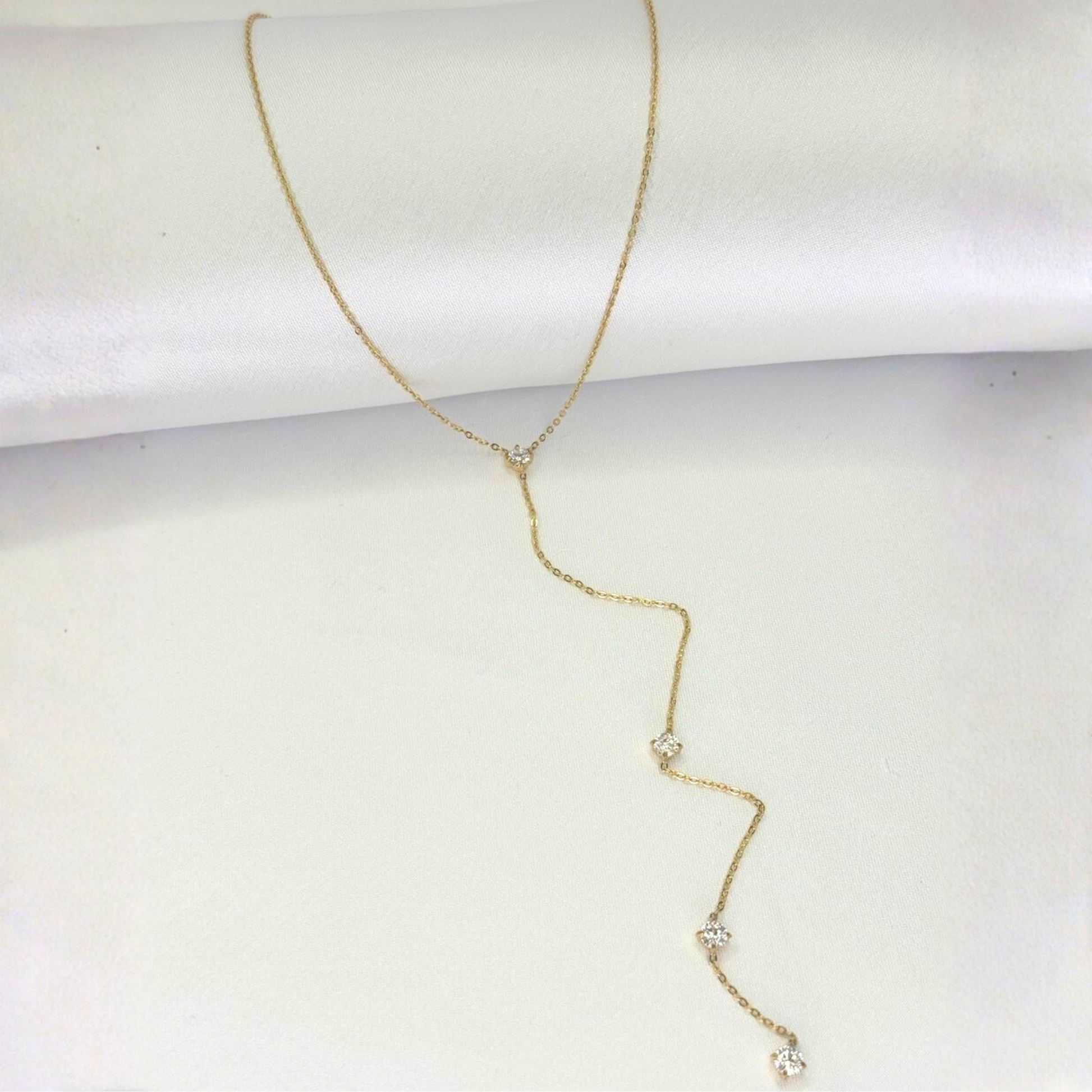 Effortless sparkle, endless style. This delicate gold-toned Stainless Steel necklace features an elegant Y-drop with perfectly spaced, brilliant CZ stones that appear to float along the chain. The perfect adjustable piece for deep V-necks or layering.