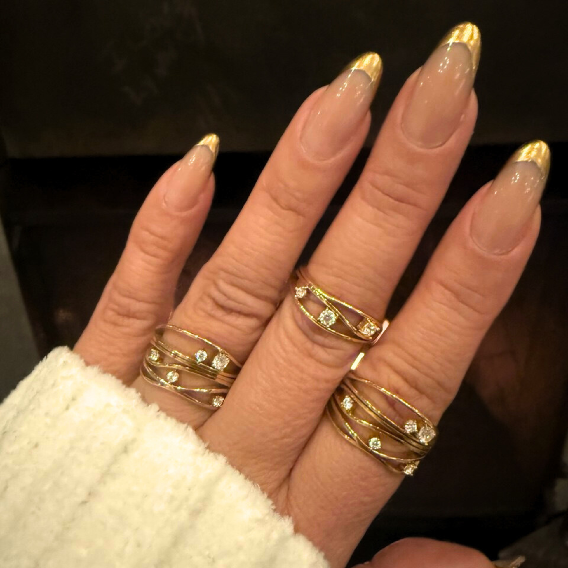 A sophisticated wide band ring featuring layered, flowing gold-tone bands that mimic gentle waves. Accented with five scattered, brilliant-cut crystals to create a unique, celestial sparkle.