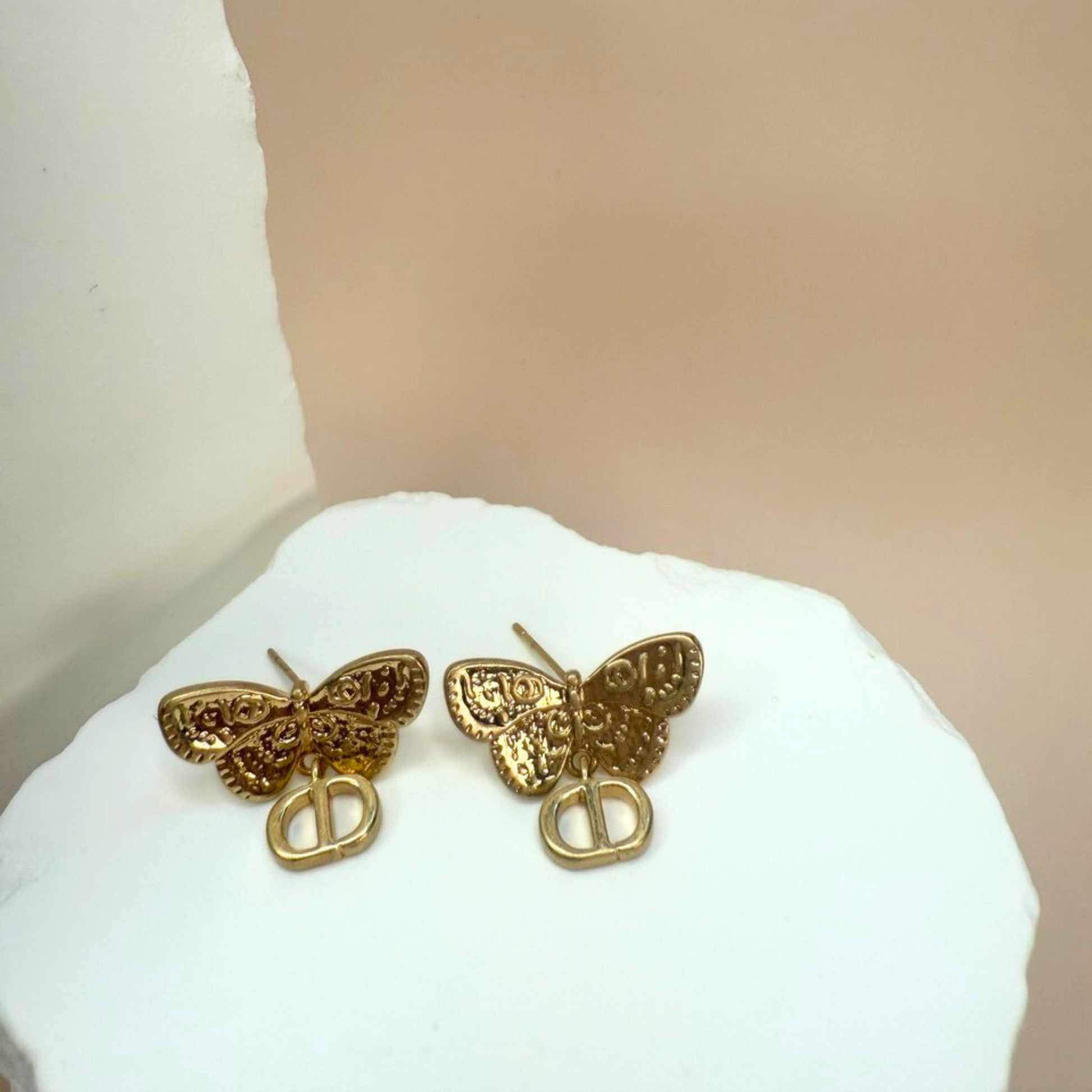 These charming dangle earrings feature a beautifully detailed butterfly stud, from which a delicate interlocking charm hangs. Perfect for adding a sophisticated and feminine touch to any outfit, they're designed to be a timeless accessory.