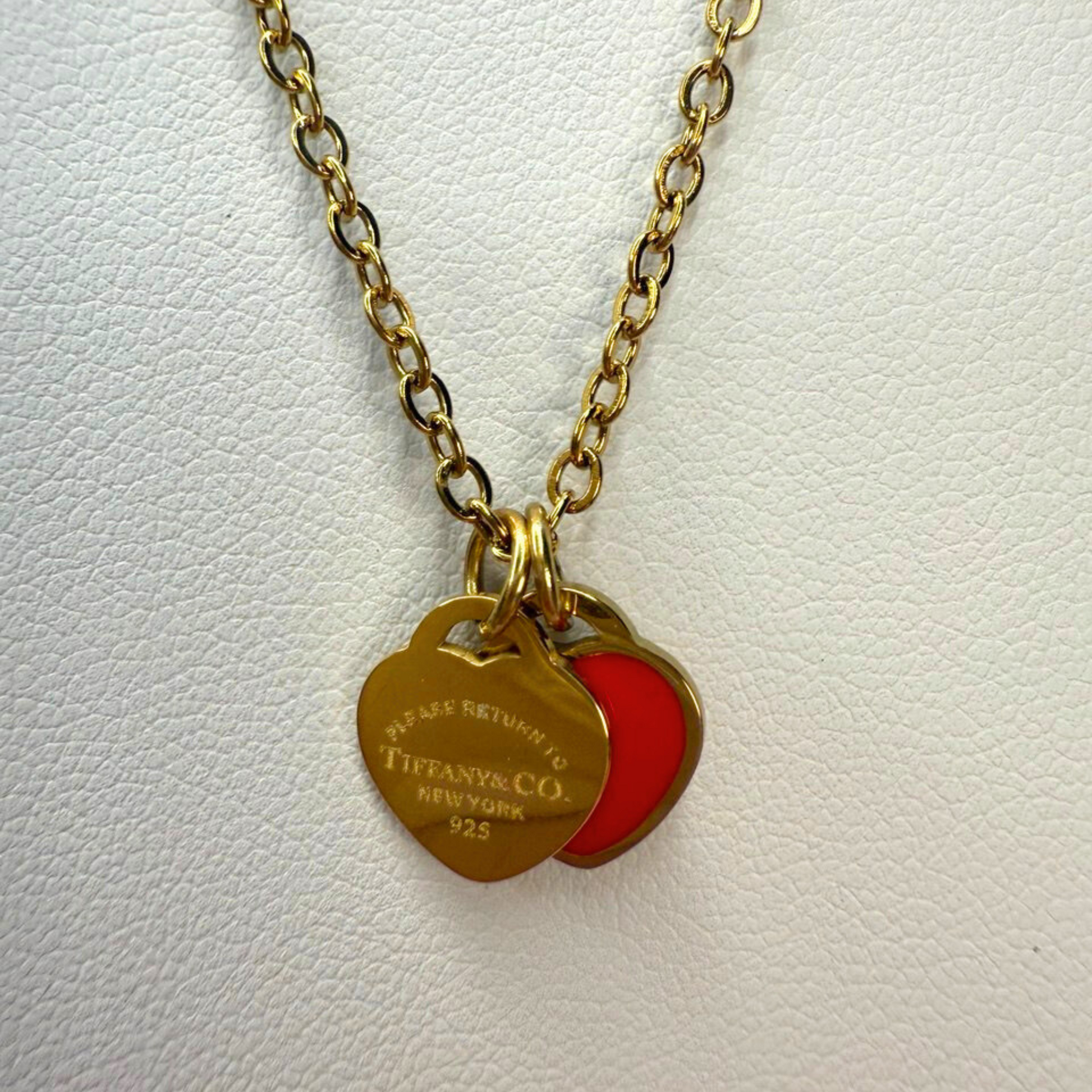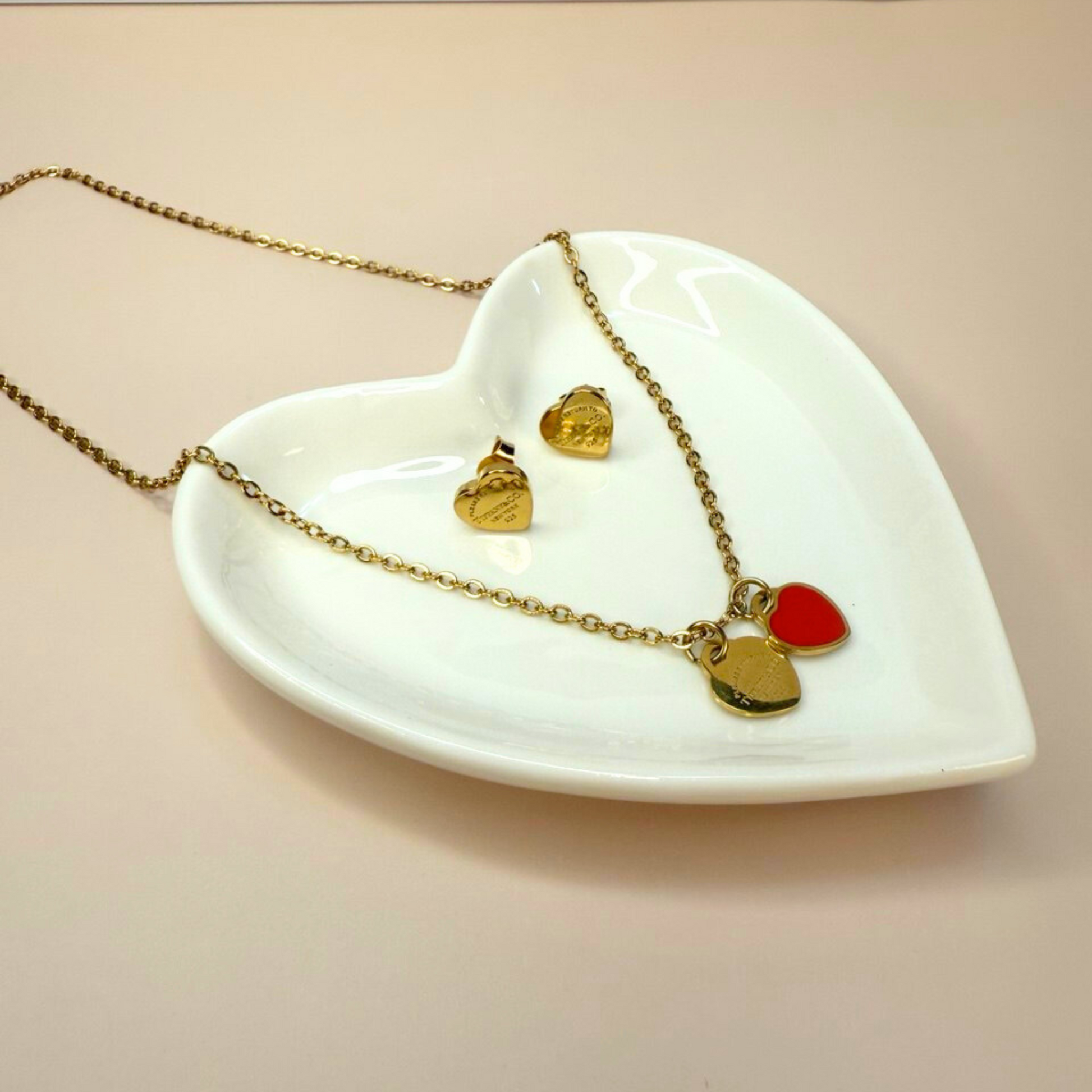 A timeless expression of elegance and romance. This captivating set features a double heart necklace—one classic and engraved, the other a bold, vibrant red—and matching heart stud earrings. Wear them together for a coordinated look or separately for a touch of individual charm. It's the perfect set to celebrate a special bond or add a classic touch to any collection.